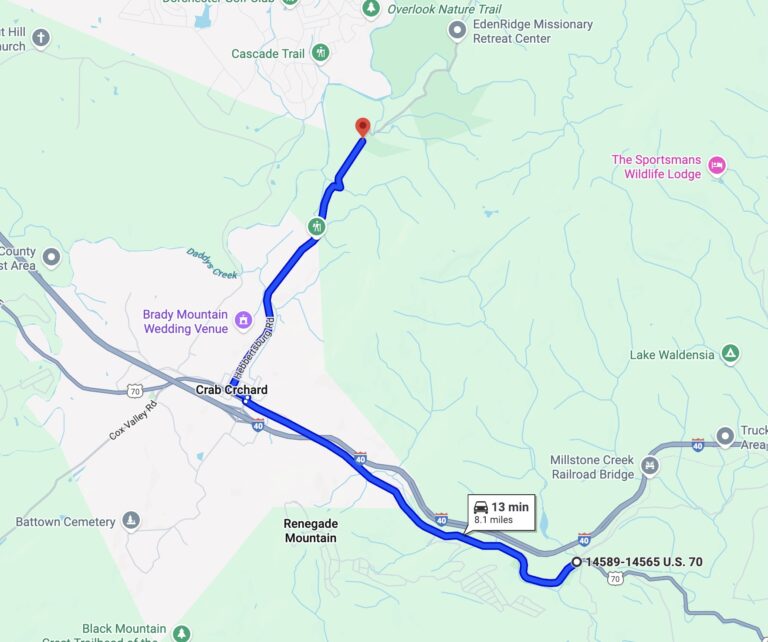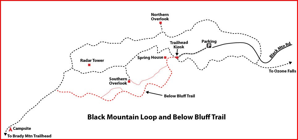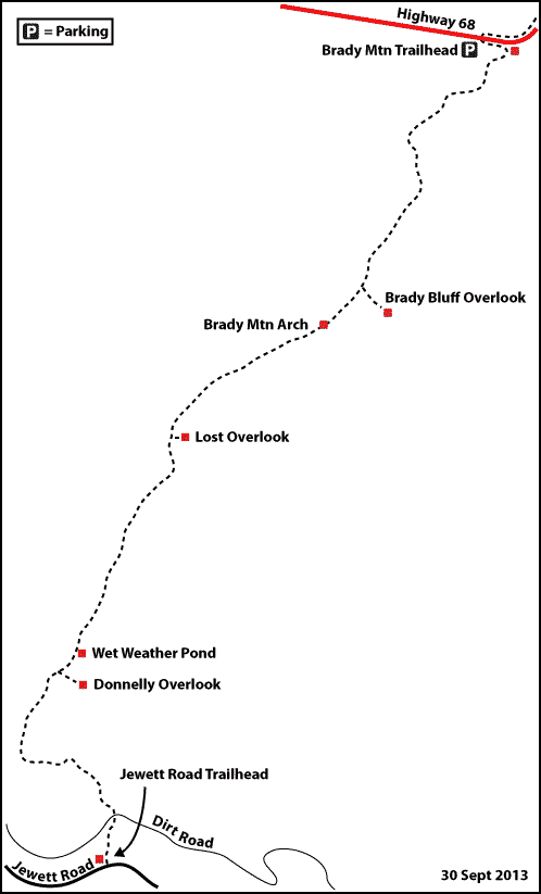 Brady Mountain Trailhead on Hwy 68; take TN 68 for 4.6 miles from the Highway 68/127 junction just east of Crossville, Tennessee. The trailhead is a large paved pull-off on the right at the top of the rise above Grassy Cove. Brady Mountain Trailhead serves as the southern terminus for the Black Mountain Section and the northern terminus for the Brady Mountain Section.