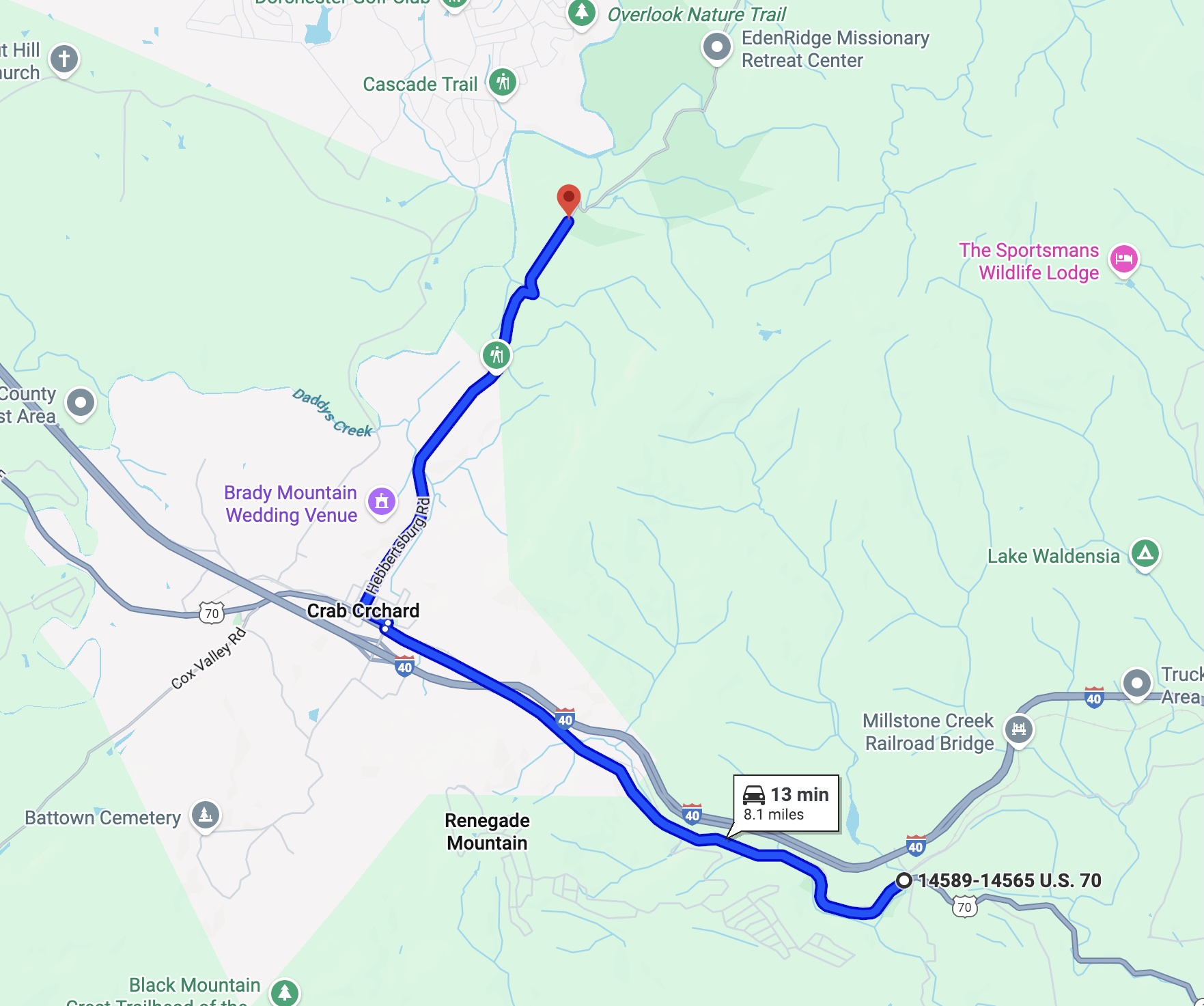 An alternate route, on the west bank of Daddys Creek is under construction but it will not be complete until a bridge is constructed over Daddys Creek near the Fairfield Glade Overlook Trail. Trail 4.3 Peavine Road to Whiteoak Branch Bridge is part of this alternate route. There is no completion date published for the Daddys Creek bridge.