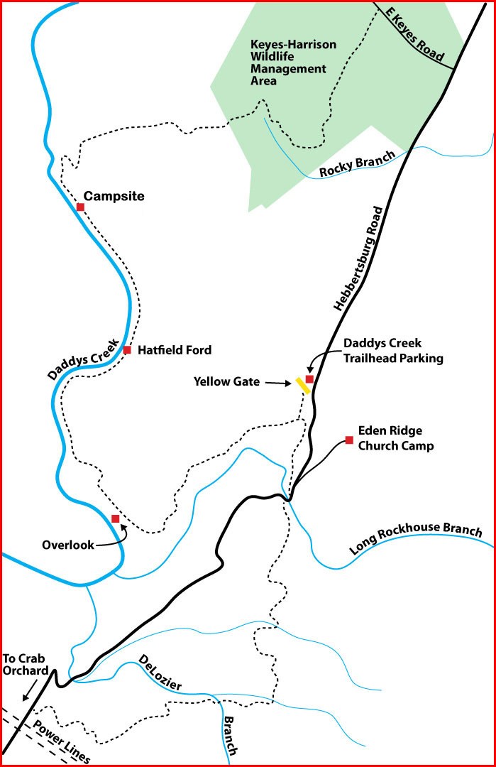 From East or West, take I40 Exit 329, Crab Orchard. From East, turn right; from West turn left toward the little town of Crab Orchard. Cross US 70 and the railroad track. Turn left on Main Street. In a short distance turn right on Hebbertsburg Road. In 5.2 miles pass the yellow gate parking area on the left. There is a large sign on the left at the trailhead that reads “Cumberland Trail Daddy’s Creek”. Continue another 1.2 miles to East Keyes Road on left. See a large TDEC sign for Keyes-Harrison WMA. Turn left onto East Keyes Road. Shortly on the left is an opening into the power line right of way. You can park here and walk East Keyes Road for about .3 mile to the trailhead on the left or continue about .3 mile to the trailhead on the left and park on the either side of the road but well off the road.
